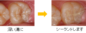 むし歯になりやすい奥歯の溝の部分をレジン(プラスチック)、または歯科用セメントで埋めてしまう予防処置です。歯を削らずにお掃除して塗るだけの感覚ですのでお子様もストレスを感じずにできます。