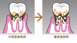 歯周病の進行段階は大きく分けて、 「歯肉炎→軽度歯周炎→中等度歯周炎→重度歯周炎」という4段階に分けられます。歯ぐきから血が出るといった症状がある場合は早めの受診をお勧め致します。